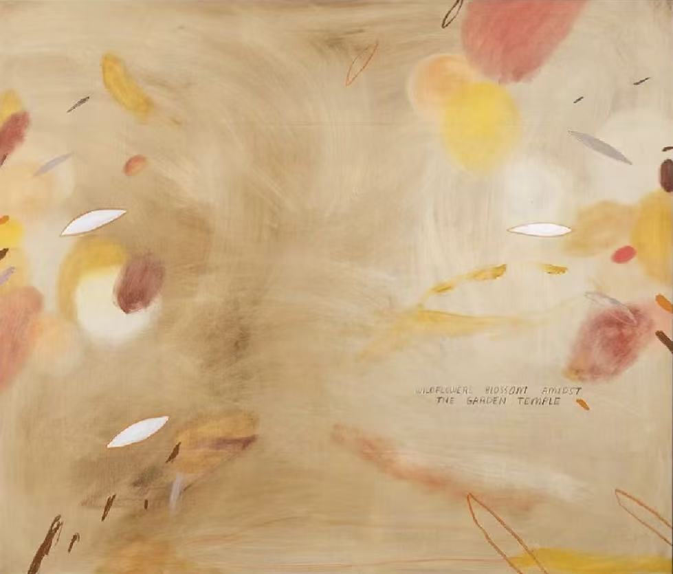 The ground is a warm pale ochre — closer to unbleached linen than true white, and closer to natural plaster than beige. Soft blush, dusty rose, and muted yellow forms drift across it in loosely rendered clusters that suggest petals without illustrating them. The center of the composition opens into something almost luminous: a void that reads lighter than the surrounding canvas, creating quiet tension between fullness at the edges and restraint in the middle.