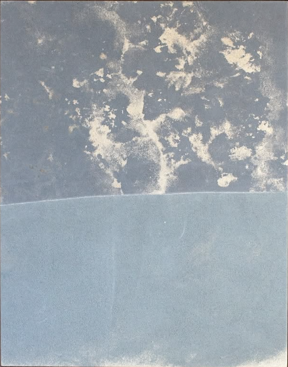 The dividing line is the whole logic of the piece. Above it, the surface is dense with organic cream and off-white forms that feel accumulated rather than painted — closer to a cyanotype or salted paper print than a traditional brushwork abstract. Below it, the field goes almost completely still. That contrast — restless above, open below — is what gives the painting its spatial presence. The tension sits right at the horizon, then dissipates downward.