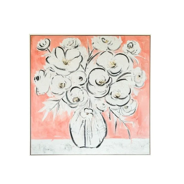 View the productThe first thing you notice is the coral. Not a saturated pink, not a dusty terracotta — a warm, slightly washed coral that takes up most of the canvas and sets the mood before the flowers even register. Then the blooms come into focus: white and grey petals built up in loose, confident strokes, gathered into a round glass vase that's suggested with quick black linework rather than carefully drawn. Small flecks of gold sit at the flower centers, catching light briefly before the eye moves on.