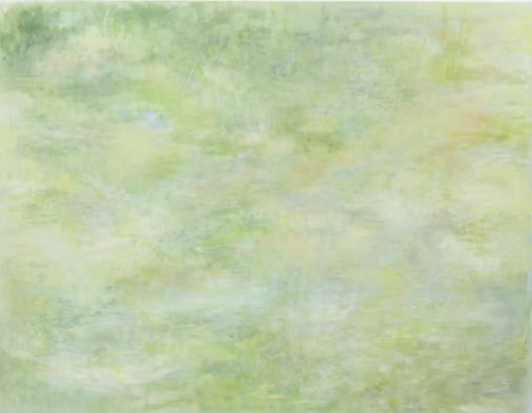 The palette stays almost entirely within a cool-green register. Pale yellows and muted blues drift through the mid-ground, while occasional warm ochre and dusty rose notes surface briefly before dissolving back into the ground. Darker greens gather at the upper corners — not heavy, but present enough to give the composition a quiet sense of framing weight. The lower half washes lighter, which gives the whole piece an upward visual release that feels less like a painting and more like a clearing.