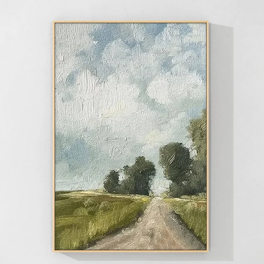 A textured, hand-painted country road landscape that adds visual depth and quiet atmosphere to neutral, nature-leaning interiors.