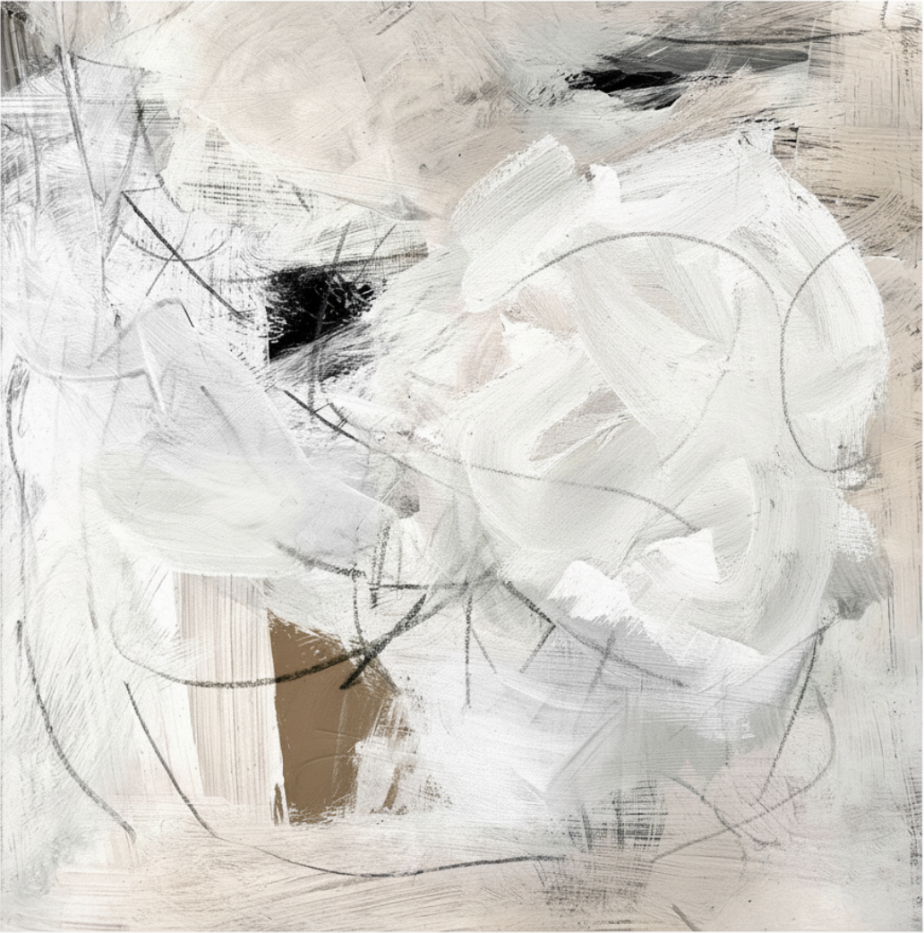 View the productThe first thing you notice about Monochrome Abstract Quiet Interval isn't a color or a shape — it's the surface. Broad white brushstrokes move across a pale, textured ground in loose, overlapping arcs, with thin graphite lines looping beneath the paint where the layers thin out. It reads as a painting that was built rather than performed.