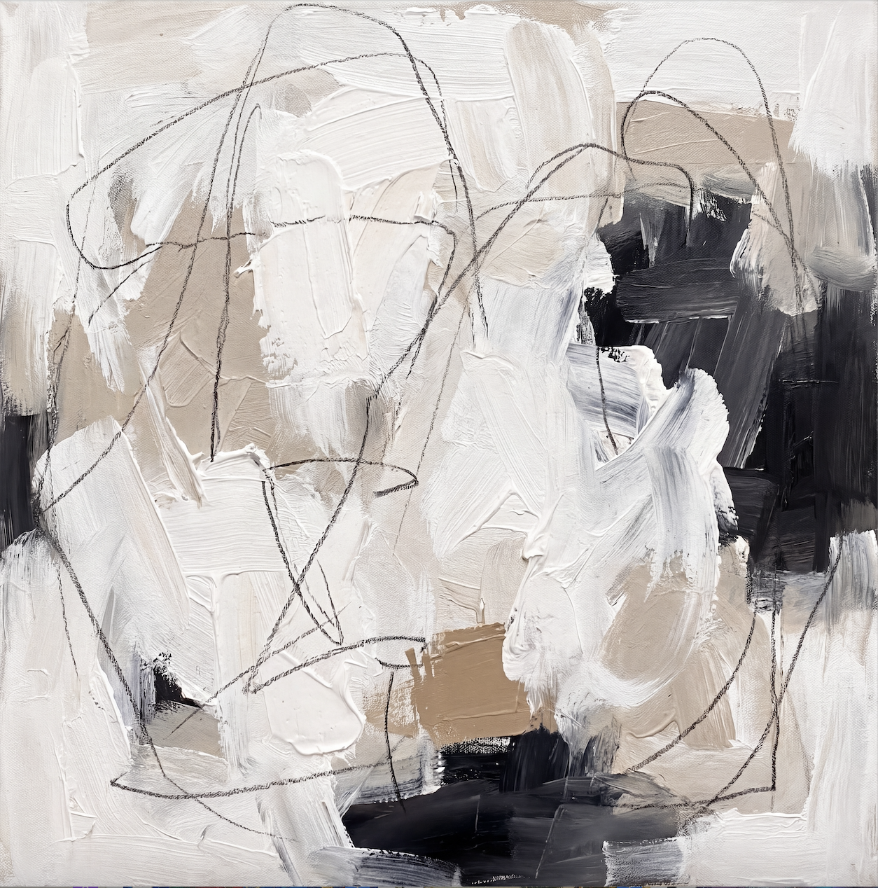 View the productQuiet Interval reads as a textured monochrome abstract before anything else. Broad strokes of white, chalk, and warm linen layer across the canvas, weighted by a cluster of near-black in the upper right and a darker pool near the lower center. Thin graphite lines loop above the paint like a second, looser pass — almost a sketch sitting on top of a finished thought. The surface is thick and physical, the kind of hand-painted work that catches sidelight and shifts slightly through the day.