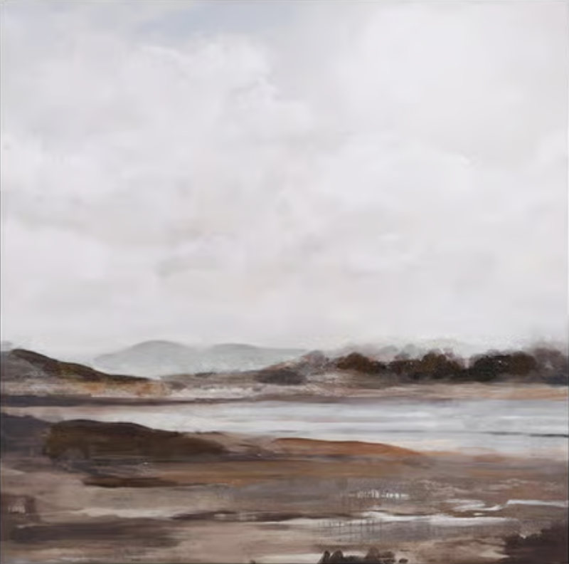 View the productAt first glance, Still Shore reads as almost monochromatic — a wide, flat landscape under a pale, cloud-laden sky, its palette held deliberately narrow. Taupe, umber, cool grey, washed white. The horizon sits low. A ridge of hills dissolves softly into mist, edged by dark tree forms that suggest depth without sharpening into detail. The foreground is broad and earthy, its surface broken by what looks like shallow pooling or wet sediment catching the same diffuse light as the sky above.