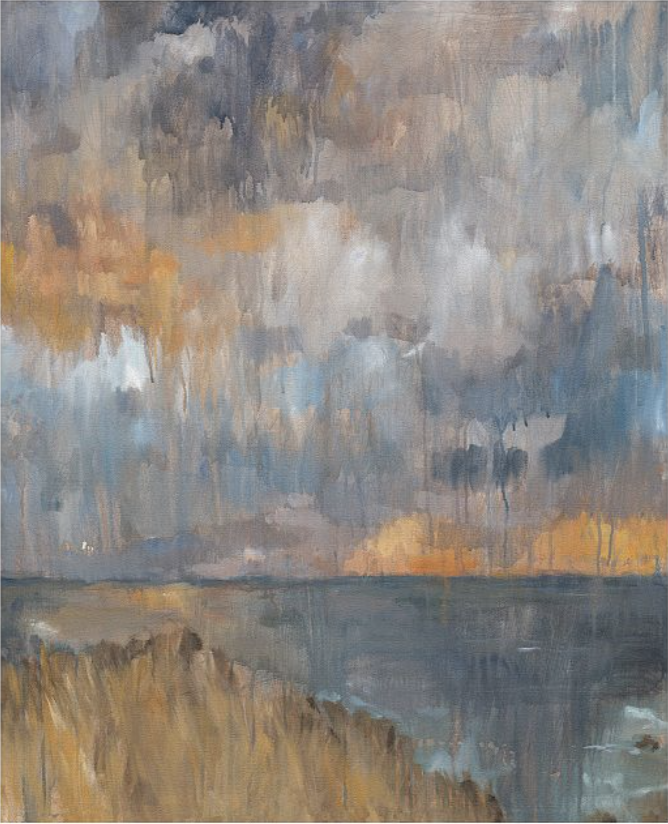 View the productStormy Landscape Blue Threshold opens with a sky that takes up most of the canvas — a dense weight of greys and slate blues broken by warm amber light pushing through like embers behind cloud. Below that weather, a dark still water holds a flat horizon, and the foreground breaks into ochre and sienna reeds rendered in loose, vertical marks. Paint bleeds downward in thin streaks, softening the line between sky and reflection so the whole piece feels wet, unresolved, and quietly charged.