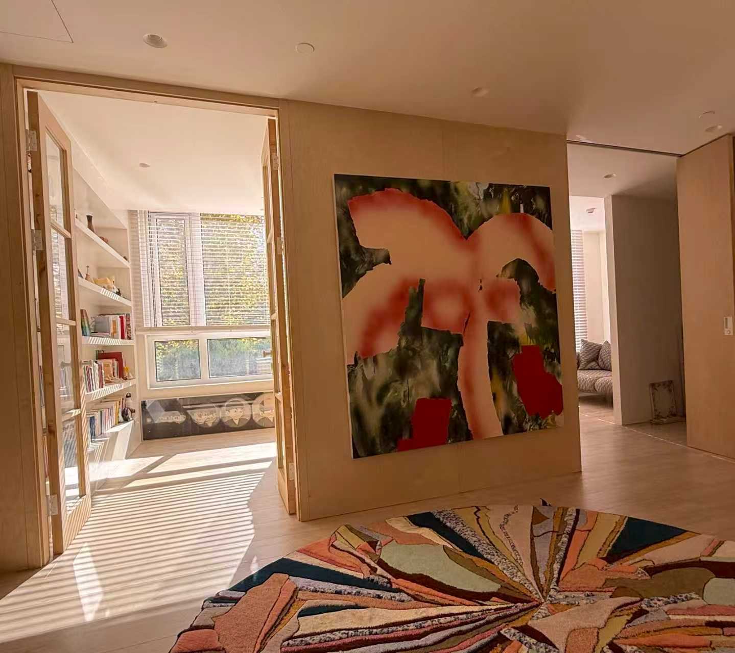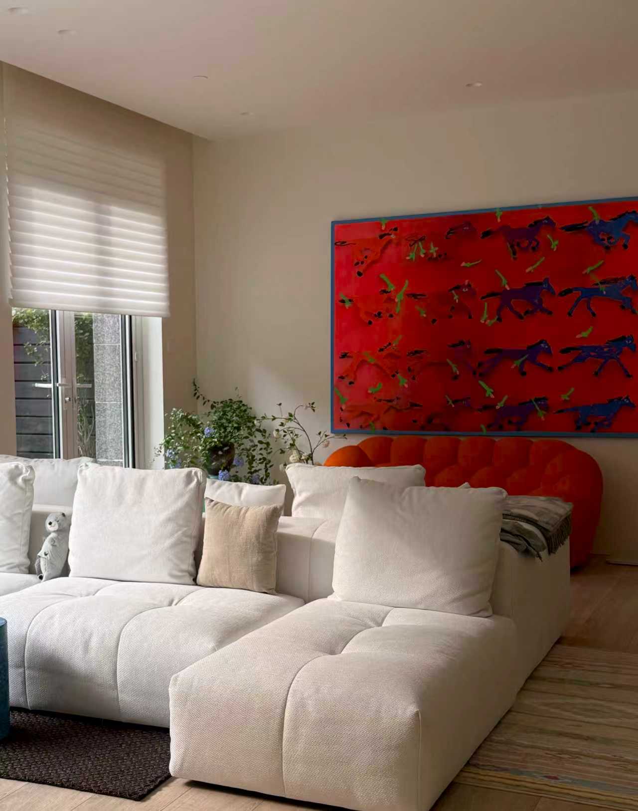 Above a low sofa in a living room, the painting's soft spread of forms fills horizontal wall space without crowding it — pairing naturally with linen upholstery and light oak side tables. In a bedroom, positioned behind the headboard, the muted palette recedes gently into the wall, offering visual interest without demanding attention before sleep. A dining room with pale walls and a timber table would absorb its warmth easily, the terracotta and ochre tones echoing natural wood grain. The composition's open upper half suits high-ceilinged spaces where the negative space can extend upward rather than compress.